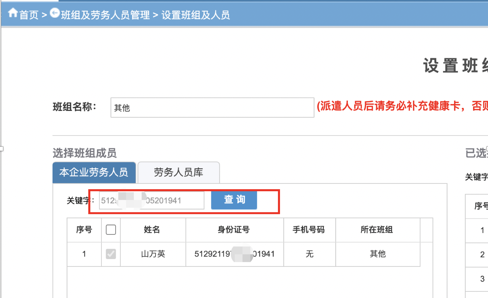 - 根据身份证号,在“本企业劳务人员“中查询。(图2)